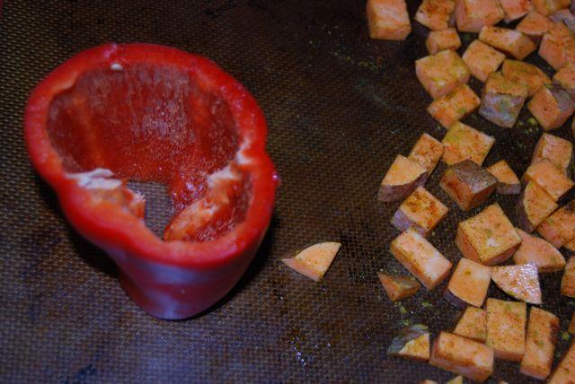 While he was working on that, I got to work on my dinner. I’m not a fan of traditional stuffed peppers but I thought putting this stuffing in a pepper would be delicious! I started by cooking some quinoa, and popping my red pepper in the oven.