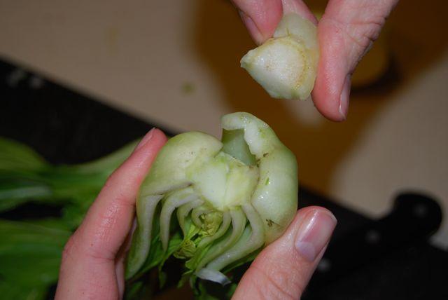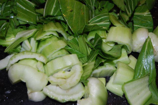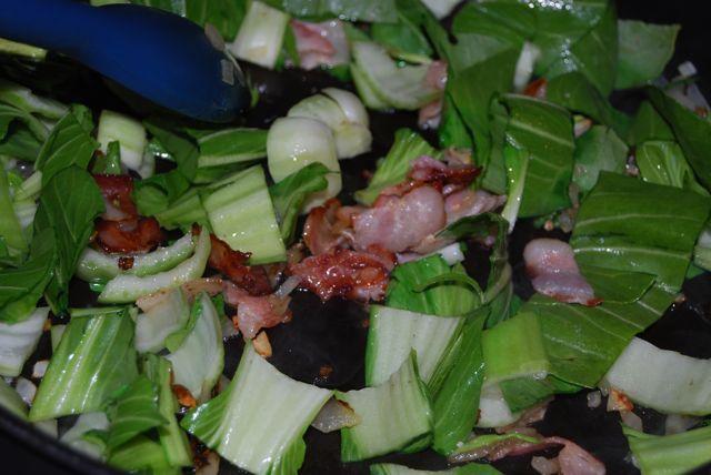 We also bought some baby bok choy which we really enjoy, but the past several weeks we’ve tried to buy it, it has not looked its best. Today we scored a great looking bunch. Although we like it, we really haven’t cooked it all that often, so the hubby did a little google research and then got to work sauteing it with some bacon, onions and garlic.
