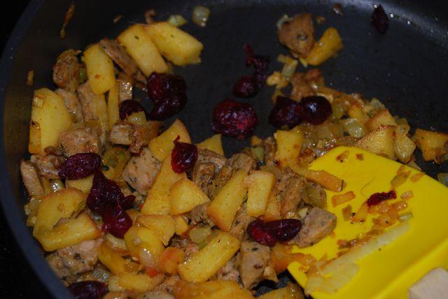 Next, I chopped up some garlic, onion and celery and put them in a saute pan. While those cooked, I diced up a chicken sausage, half an apple and some craisins and added that to the pan as well. I also used a little bit of curry powder and paprika but didn’t want to add too much because I like the flavor of the chicken sausage.