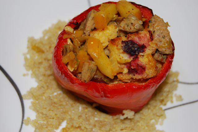 your stuffed pepper looks great! i love making stuffed peppers – but i usually stick with pretty standard stuffing: quinoa, veggies, sausage, breadcrumbs, etc. i would never have thought to put in those muffins or craisins!