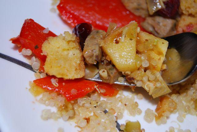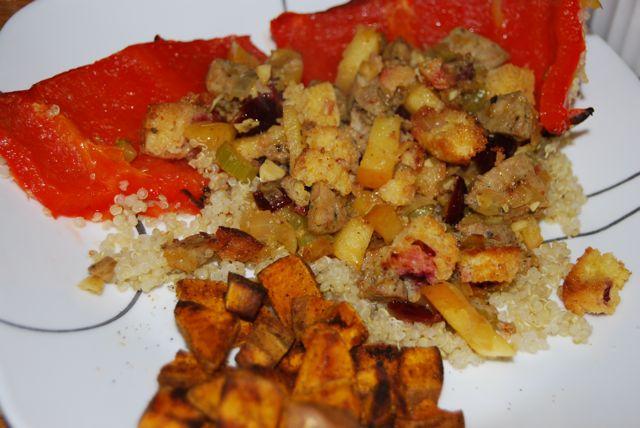 When the potatoes were done, I took everything out of the oven and put the pepper on a bed on quinoa. Then, I added the muffin bits into the sausage mixture, along with a little chicken broth and mixed everything together.