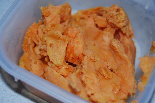 Slice the sweet potato open and scoop out the cooked potato.