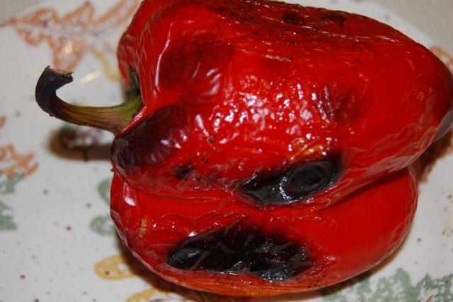 Preheat oven to 425 degrees. Place red pepper on a baking tray and roast until the skin is blackened and blistered, about 40 minutes.
