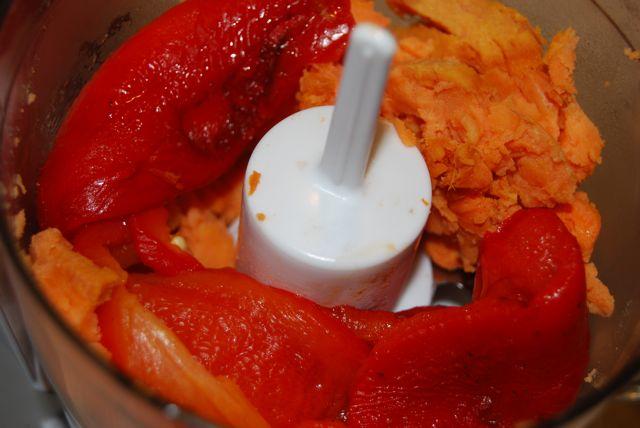 Place the red pepper and sweet potato in a small food processor.
