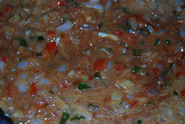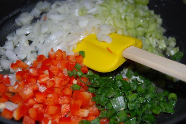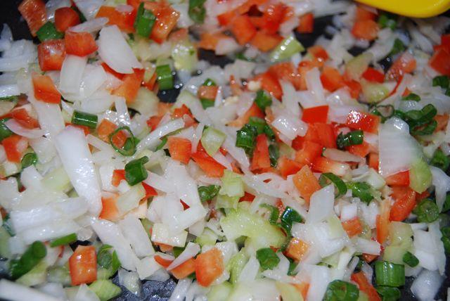 2. Melt butter in a large pan. Add onions, celery, peppers, green onion, garlic, Tabasco, Worcestershire, and seasonings.