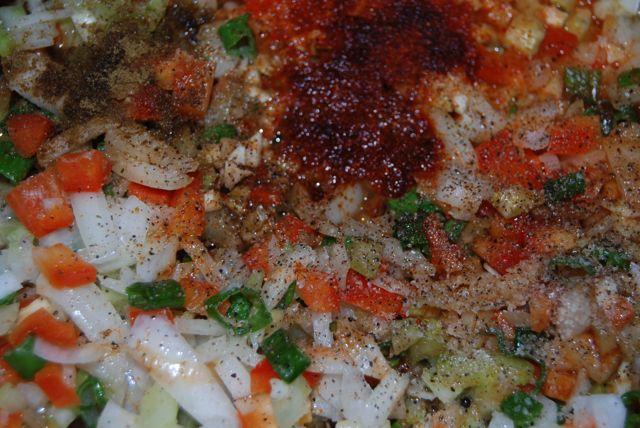 Dice your veggies and saute in butter. Add the spices, Tabasco and Worcestershire.