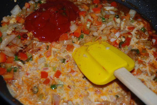 3. Saute until soft, then stir in milk and ketchup. Cook 2 min more.