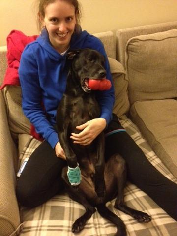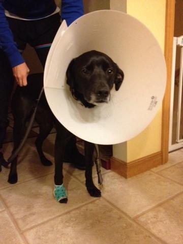 We have a chocolate lab (Jake) and I cannot imagine him keeping that cone or bandage on for more than one minute. He’s our baby so naturally we’d try our best, but I have a feeling he would win.
