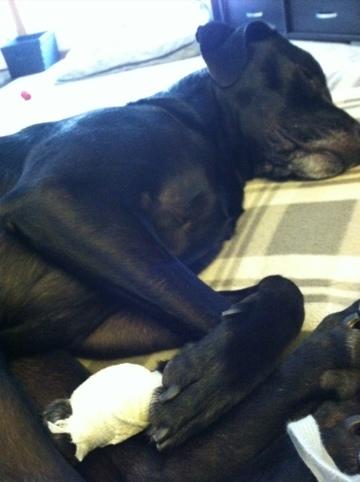 Wednesday/Thursday: we were worried he would hurt his foot more if he kept trying to get the cone off so we left him occasionally with the paw wrapped and sprayed with bad tasting stuff. Every time hubby came home the bandage was nibbled on but relatively intact. He pulled it off a couple times while we were home and we put it back on.
