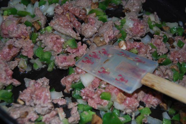 2. Combine garlic, onion, green pepper, mushroom and turkey in a large skillet over medium heat.