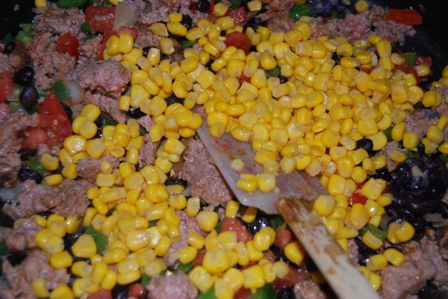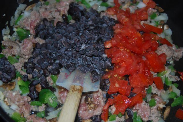 Start by cooking your turkey with some garlic, onion, mushroom and green pepper. Then add some black beans, tomato and corn. I seasoned the mixture with cumin and cayenne pepper.