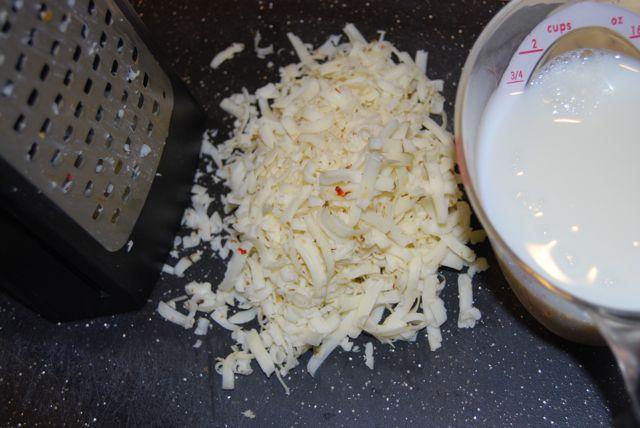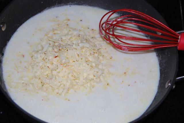 Add your barley to the meat mixture and remove from heat. Then, melt 1 Tbsp butter in a pan and add 2 Tbsp flour. Whisk together for 1 minute, then add some warm milk. Bring to a simmer, then added some shredded pepperjack cheese and stir until melted. Then add the cheese mixture to the meat mixture. I used 1 1/2 c milk and about 1 1/2 c cheese, which is a reduced amount compared to what Rachel used. I didn’t even end up using all of that once I had the cheese mixture made. It’s up to you how cheesey you want to make it. I probably would have been fine with about 3/4 c milk and 1 c cheese.