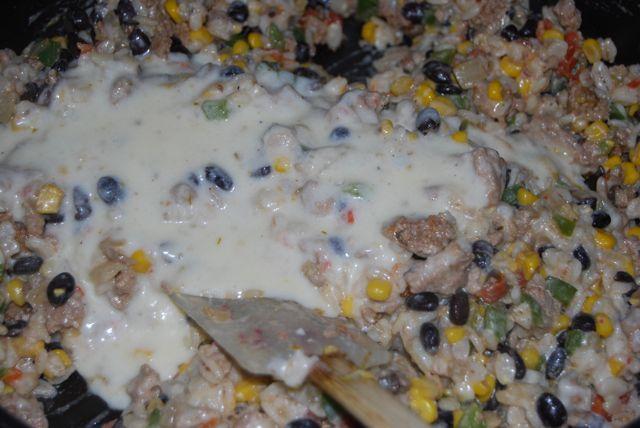 8. Pour cheese mixture over meat mixture and stir to combine.