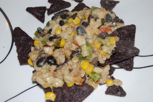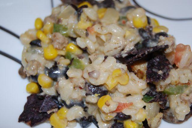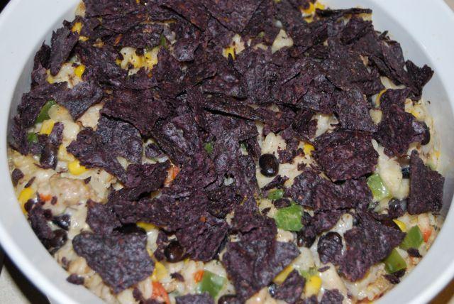 Transfer the mixture to a baking dish, cover with foil and bake at 400 degrees for 20 minutes. Uncover, top with crumbled tortilla chips and return to the oven for 10 more minutes.